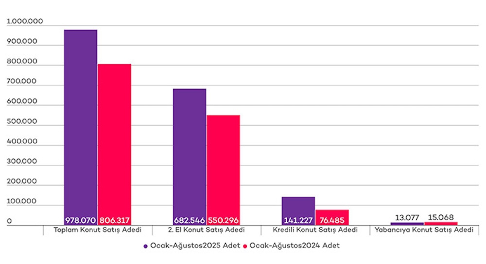 Konut satış adetlerine baktığımızda ağustos ayında 143 bin 319 adet konut satıldığı görülüyor. Bu rakam ile konut satış adedi geçen sene ağustos ayına göre %6,8 artış göstermiş oldu. 2025 yılının Ocak-Ağustos döneminde ise konut satışları geçen senenin aynı dönemine göre %21,3 arttı ve 978 bin 70 olarak gerçekleşti. Geçen senenin Ocak-Ağustos dönemi ile karşılaştırıldığında en önemli artışın %84,6 ile kredili konut satışlarında olduğu görülüyor. Kredili konut satışları geçtiğimiz sene toplam satışların %9,5’ini oluştururken bu sene %14,4’lük paya sahip oldu.