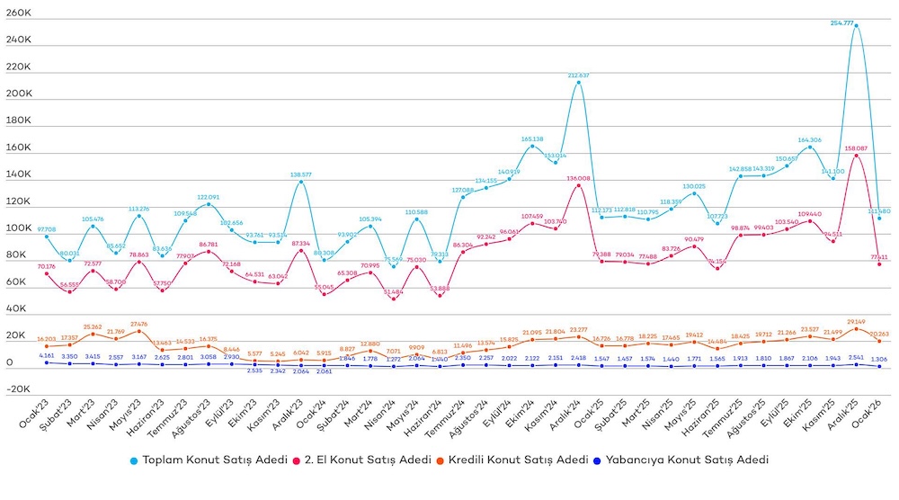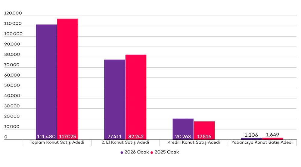 Türkiye genelinde ipotekli konut satışları Ocak ayında bir önceki yılın aynı ayına göre %15,7 oranında artarak 20 bin 263 oldu. Diğer konut satışları ise Ocak ayında bir önceki yılın aynı ayına göre %8,3 oranında azalarak 91 bin 217 oldu. Toplam konut satışları içinde ipotekli satışların payı %18,2, diğer satışların payı %81,8 olarak gerçekleşti.